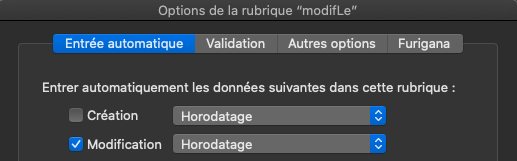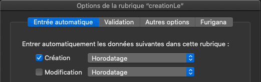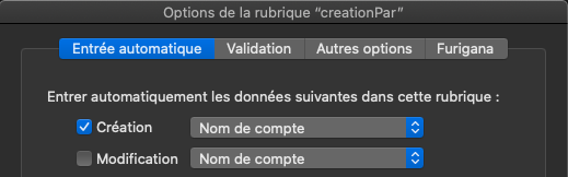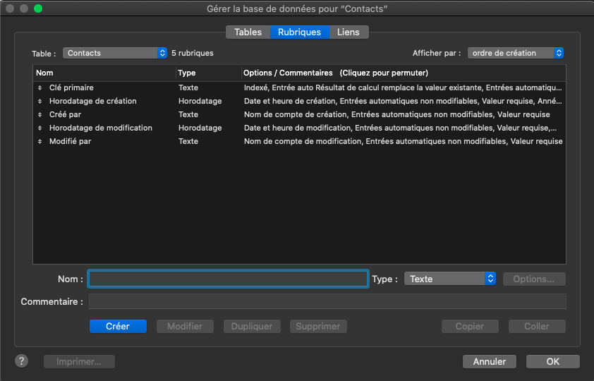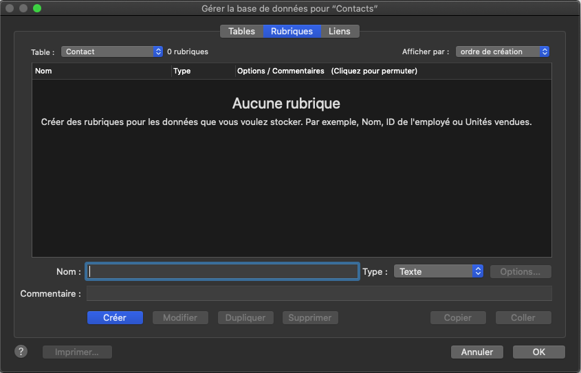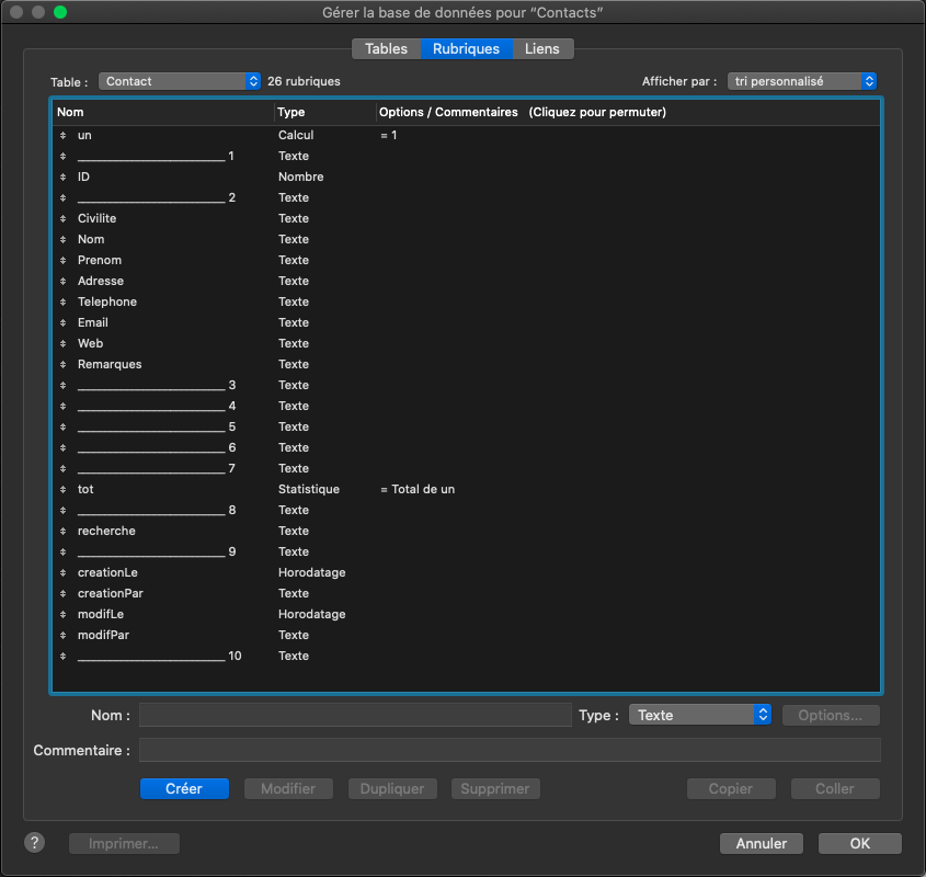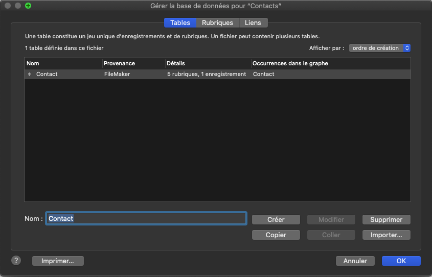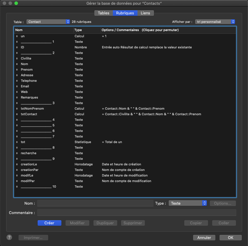Comme d'habitude pour tout projet FileMaker, commencez par créer le fichier qui contiendra les différentes parties de l'application. Figure 1 Choisir un nom de fichier Pour la suite de ces lignes, le fichier sera nommé : "Contacts.fmp12".Vous pouvez bien sûr nommer votre fichier comme bon vous semble, de préférence en respectant les règles d'écritures → décrites en Annexe. Créez maintenant le fichier qui contiendra votre nouvelle application FileMaker : Ouvrez FileMaker Pro si ce n'est pas déjà fait.Cliquez sur Fichier + Créer...Sélectionnez Vide, puis cliquez sur le bouton Créer Entrez un nom de fichier, puis cliquez sur Enregistrer Vous devriez avoir une fenêtre ouverte sur l'onglet Rubriques : Figure 2 Cette fenêtre permet comme son nom l'indique de gérer les tables, les rubriques et les liens de la base de données de votre application.En cliquant sur OK, la fenêtre se referme, pour la rouvrir, il faudra cliquer sur Fichier + Gérer + Base de données... Préparation de la table Une première table par défaut est créée automatiquement par FileMaker, elle porte le nom du fichier que vous avez indiqué ou est nommée simplement "Table".Pour votre application, vous avez besoin d'une table nommée "Contact" qui contiendra toutes les données et informations de vos contacts : Cliquez sur l'onglet TablesSi le nom de la table est différent de "Contact", sélectionnez la table en cliquant dessus, puis changez son nom (en bas) par "Contact", puis cliquez sur le bouton Modifier. Figure 3 Préparation des rubriques Pour partir sur de bonnes bases, commencez par supprimer les rubriques déjà créées par défaut : Cliquez sur l'onglet RubriquesSélectionnez toutes les rubriques — en cliquant sur la première, puis en cliquant sur la dernière en maintenant la touche majuscule enfoncée.Cliquez sur le bouton Supprimer, puis confirmez la suppression. Figure 4 Vous pouvez maintenant vous occuper des rubriques nécessaires à votre table Contact. Définition des rubriques Votre table Contact va contenir un certain nombre de rubriques que vous pouvez classer par importance.1) Les rubriques qui contiendront les données spécifiques à vos contacts Nom de la rubrique Type Commentaire Civilite Texte ex : Mme, Mr Nom Texte Prenom Texte Adresse Texte Telephone Texte Email Texte Web Texte Remarques Texte pour la saisie libre d'autres informations 2) Les rubriques qui serviront à l'identification et à la traçabilité des enregistrements Nom de la rubrique Type Commentaire ID Nombre identifiant unique d'un contact (automatique) creationLe Horodatage date de création du contact (automatique) creationPar Texte nom du compte qui a créé le contact (automatique) modifLe Horodatage date dernière modification du contact (automatique) modifPar Texte nom qui a modifié le contact (automatique) 3) Les autres rubriques calculées ou temporaires pour le bien de l'application Nom de la rubrique Type Commentaire un Calcul contient le chiffre 1 tot Statistique totalise le nombre d'enregistrements recherche Texte _______________ 1 Texte pour délimiter les rubriques entre elles txtNomPrenom Calcul regroupe le nom et le prénom txtContact Calcul permet d'afficher directement le nom complet du contact Création des rubriques Peu importe l'ordre dans lequel vous créez vos rubriques, FileMaker propose plusieurs tris possibles, vous utiliserez l'ordre personnalisé qui vous permettra d'organiser parfaitement vos rubriques.Commencez par créer les rubriques que l'on retrouve dans la plupart des tables d'une application (même si dans votre cas, vous n'aurez qu'une table Contact) : Si vous avez fermé la fenêtre, cliquez sur Fichier + Gérer + Base de données...Cliquez sur l'onglet RubriquesSaisissez "ID" dans le nom de la rubrique (en bas), sélectionnez le type Nombre (à droite), puis cliquez sur le bouton CréerRecommencez avec : "creationLe" de type Horodatage "creationPar" de type Texte "modifLe" de type Horodatage "modifPar" de type TexteCréez la rubrique "un" de type Calcul, dans la fenêtre qui s'ouvre saisissez le chiffre 1 puis cliquez sur le bouton OK (en bas à droite)Créez la rubrique "tot" de type Statistique, dans la fenêtre qui s'ouvre sélectionnez "Total de" et la rubrique "un" que vous venez de créer, puis cliquez sur le bouton OK (en bas à droite)Créez la rubrique "recherche" de type Texte Pour organiser visuellement vos rubriques, vous allez maintenant créer les rubriques qui serviront de séparateurs.Pour cela vous utiliserez le caractère souligné "_" répété une vingtaine de fois, suivi d'un espace et d'un chiffre, ceci vous permettra de créer une sorte de trait numéroté pour délimiter vos rubriques, comme cela : _______________ 1 Créez maintenant la rubrique "_______________ 1" de type Texte.Une fois cette dernière créée, cliquez dessus et copiez-la (CMD + C sur Mac ou CTRL + C sur Windows).Collez-la dix fois (CMD +V ou CTRL + V), vous devriez voir apparaître les rubriques "_______________ 2" jusqu'à "_______________ 10" Organisons des premières rubriques Pour déplacer une rubrique, cliquez dessus, en laissant enfoncer, puis déplacez-la de haut en bas et relâchez à l'endroit souhaité. Déplacez-les dans l'ordre suivant :un_______________ 1ID_______________ 2_______________ 3_______________ 4_______________ 5_______________ 6_______________ 7tot_______________ 8recherche_______________ 9creationLecreationParmodifLemodifPar_______________ 10 Chaque nouvelle rubrique viendra se placer naturellement à la fin et vous pourrez ainsi facilement la déplacer pour la ranger où vous le souhaitez.Vous allez expérimenter cela en créant maintenant vos rubriques de données : Créez : Civilite de type Texte Nom de type Texte Prenom de type Texte Adresse de type Texte Telephone de type Texte Email de type Texte Web de type Texte Remarques de type TexteRangez-les entre "_______________ 2" et "_______________ 3". Si tout s'est bien passé, vous devriez av