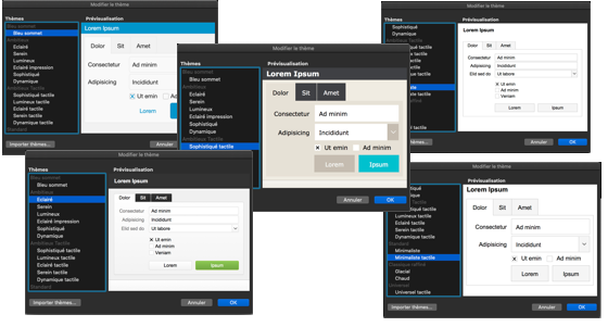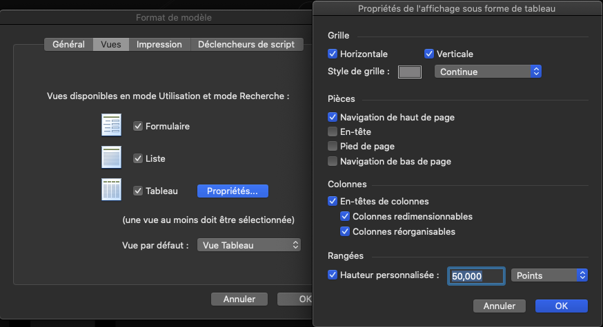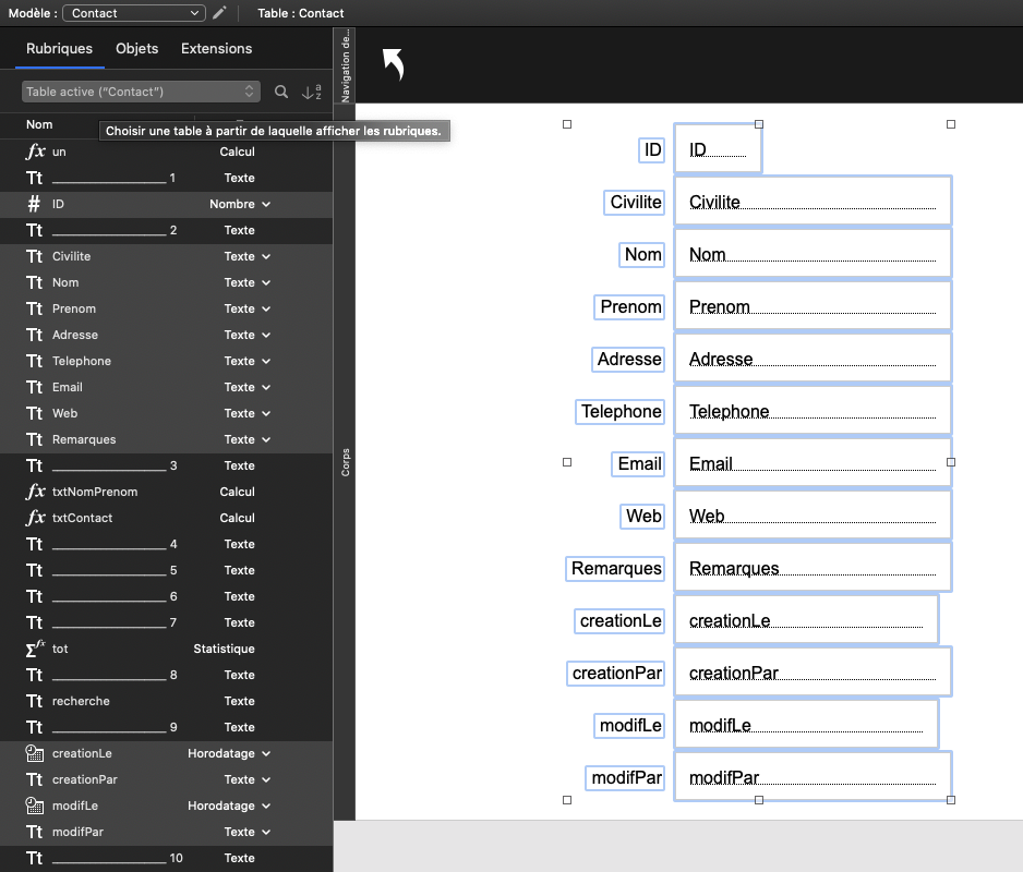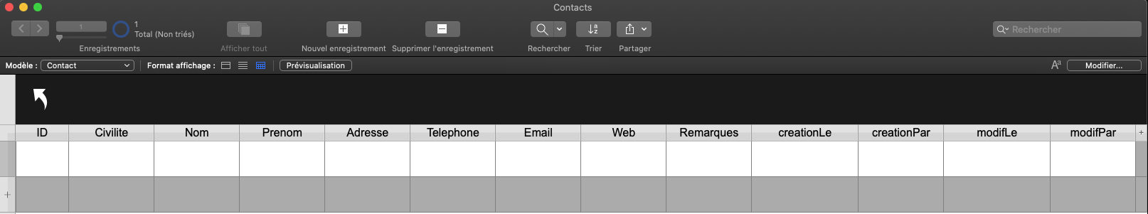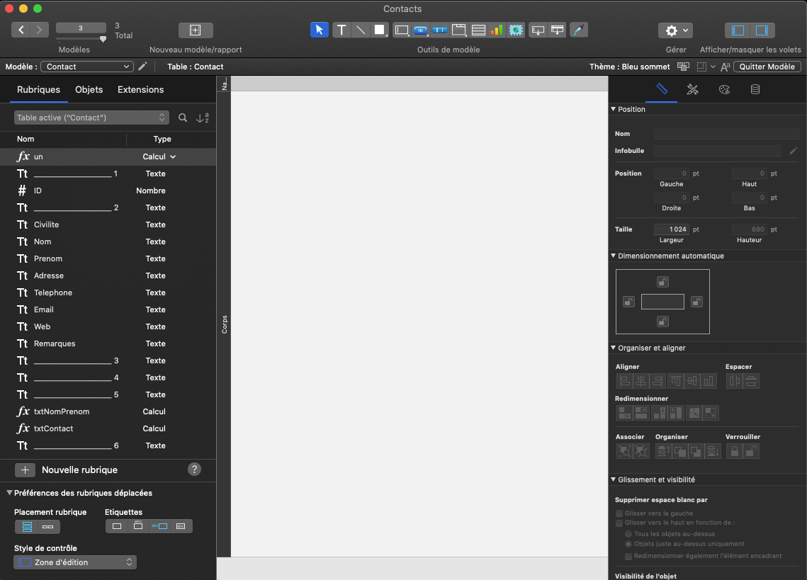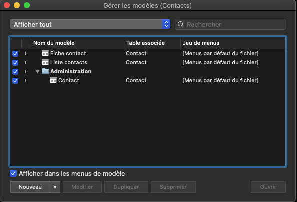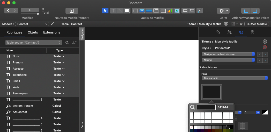 Vous venez de créer la structure de votre application avec une base de données composée d'une table Contact et d'une vingtaine de rubriques définissant vos contacts.Vous allez ensuite créer les écrans — appelés modèles dans FileMaker — qui permettront à l'utilisateur de gérer les informations des contacts dans l'application.Avant cela, vous allez :1) décrire le cahier des charges de l'application pour vous aider à déterminer les modèles qui seront nécessaires2) créer et organiser les modèles de l'application3) choisir et préparer le thème de l'application4) mettre en page le premier modèle d'administration5) importer quelques données Cahiers des charges Ce titre un peu technique vous amène ici simplement à réfléchir aux différentes fonctionnalités que vous souhaitez mettre en place dans votre application et aux éventuelles spécifications techniques pour son utilisation.Fonctionnalités :- créer un nouveau contact- saisir les informations d'un contact- supprimer un contact- rechercher un ou plusieurs contacts- trier les contacts- voir les informations d'un contactSpécifications :- mono-utilisateur- utilisation iPhone ou iPad possible depuis FileMaker Go- mode sombreVous aurez donc besoin d'un modèle fiche contact et d'un modèle liste contacts, en plus du modèle d'administration créé par défaut. Modèles de l'application Cliquez sur Fichier + Gérer + Modèles... Ne vous souciez pas de ce que vous voyez à l'écran pour le moment, suivez simplement les directives pour créer et organiser vos modèles. Création des modèles Fiche contact Cliquez sur Nouveau (en bas à gauche), puis dans la fenêtre qui s'ouvre "Nouveau modèle/rapport", indiquez le Nom du modèle "Fiche contact", puis cliquez sur le bouton Terminer. Liste contacts Cliquez sur Nouveau, puis indiquez le Nom du modèle "Liste contacts", puis cliquez sur le bouton Terminer. Contact Vous devriez avoir un modèle "Contact" créé automatiquement par FileMaker lorsque vous avez créé la table "Contact".Vous utiliserez ce(s) modèle(s) afin d'administrer et contrôler facilement les données de chaque table. Organisation des modèles Même si votre application de contacts n'a qu'une seule table pour le moment, prenez la bonne habitude de ranger son modèle "Contact" dans un dossier de modèles que vous nommerez "Administration". Toujours dans Fichier + Gérer + Modèles...En bas à gauche, cliquez sur la petite flèche à droite du bouton "Nouveau", puis sélectionnez "Dossier...", dans la fenêtre qui s'ouvre indiquez le nom de dossier : "Administration", puis cliquez sur "OK".Glissez maintenant le modèle "Contact" dans le dossier "Administration". Vous devriez obtenir la figure suivante : Figure 1 Création de l'interface tableau du modèle "Contact" Vous pouvez fermer la fenêtre de gestion des modèles et afficher le modèle "Contact" en vue tableau. Fermez la fenêtre "Gérer les modèles (Contacts)".Cliquez sur Affichage + Activer le modèle + Administration + Contact.Cliquez sur Affichage + Mode utilisation.Cliquez sur Affichage + Afficher sous forme de tableau.Si la barre d'outils ne s'affiche pas, cliquez sur Affichage + Barre d'outils Vous allez maintenant revenir en mode modèle pour mettre en forme votre modèle "Contact". Cliquez sur Affichage + Mode modèle Figure 2 Comme d'habitude, pas d'affolement devant ce nouvel écran qui est très chargé avec une longue barre d'outils en haut, un panneau à gauche avec trois onglets, un autre à droite avec quatre onglets et au centre ce que l'on appelle le "modèle" composé d'éléments (navigation, corps, ...). Vous allez y aller pas à pas. Préparation des éléments du modèle Pour ce modèle d'administration, vous aurez besoin de deux éléments de modèle :- une navigation de haut de page- un corpsSelon la version de FileMaker, vous devriez avoir déjà ces deux éléments par défaut, sinon : Cliquez sur Modèles + Eléments...Pour supprimer un élément, sélectionnez-le puis cliquez sur le bouton Supprimer.Pour en ajouter un, cliquez sur le bouton Créer..., puis sélectionnez "Navigation de haut de page" par exemple.Cliquez sur le bouton Fin quand il ne reste plus que les éléments "Navigation de haut de page" et "Corps". Figure 3 En oubliant la barre d'outils et les deux panneaux des côtés, il ne reste qu'un espace au centre sur lequel vous allez déposer des objets (rubriques, boutons, ...) qui permettront de construire l'interface de votre fiche contact.Avant cela, il faut créer un nouveau thème pour votre application. En effet FileMaker a affecté un thème par défaut — dans ces lignes, il s'agit de "Thème : Bleu sommet", c'est indiqué dans la barre grise en haut à droite : Figure 4 Création du thème Sans rentrer trop dans le détail, un thème enregistre les paramètres de tous les objets de l'interface d'un fichier FileMaker. Vous modifierez ces paramètres à l'aide du panneau de droite. Afin de respecter un certain design entre les différents modèles de votre application, il est pratique de pouvoir sauvegarder et unifier ces modifications au sein d'un même thème.Dans un premier temps vous allez choisir un thème qui vous convient dans ceux qui sont proposés par FileMaker, dont voici quelques exemples : Figure 5 Vous allez préférer un thème minimaliste et comme vous souhaitez que votre application de contacts soit utilisable sur iPhone ou iPad, vous prendrez sans hésiter le thème "Minimaliste tactile". Cliquez sur Modèles + Modifier le thème...Sélectionnez "Minimaliste tactile", puis cliquez sur le bouton OK Vous allez dupliquer ce thème de base pour ne pas l'altérer, en le renommant "Mon style tactile" par exemple. Cliquez sur Fichier + Gérer + Thèmes...Dans la fenêtre qui s'ouvre, sélectionnez "[Minimaliste tactile]", puis cliquez sur le bouton Dupliquer.Cliquez sur le bouton Renommer...Saisissez "Mon style tactile", puis cliquez sur OK, puis à nouveau sur OK. Retournez maintenant